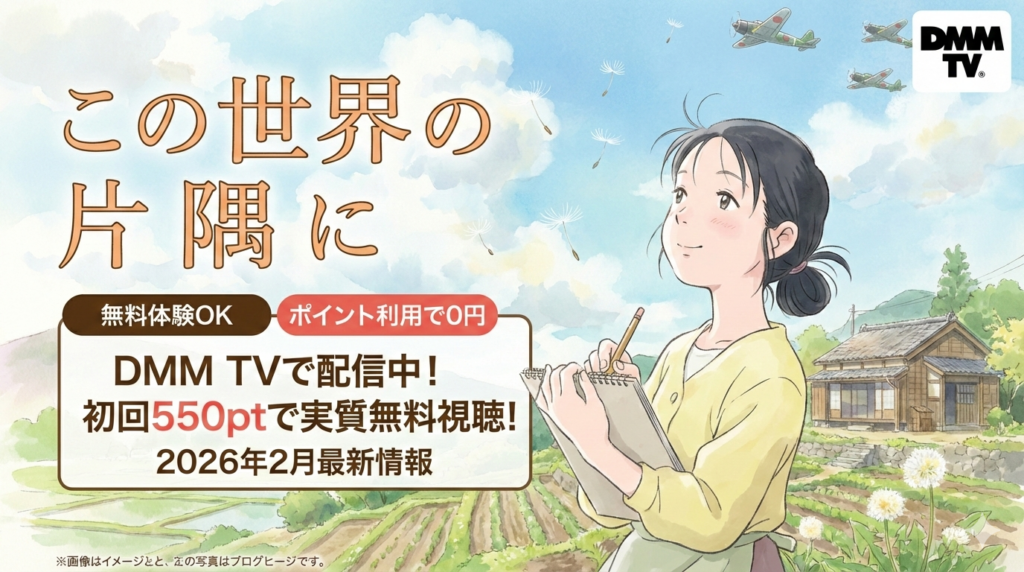 アニメ映画「この世界の片隅に」は、2016年に公開されたこうの史代さん原作の劇場版アニメです。結論から言うと、DMM TVで配信されており、初回登録時にもらえる550ポイントを使えば追加料金なしで視聴できます。2026年2月時点の最新配信情報をお届けしま... -