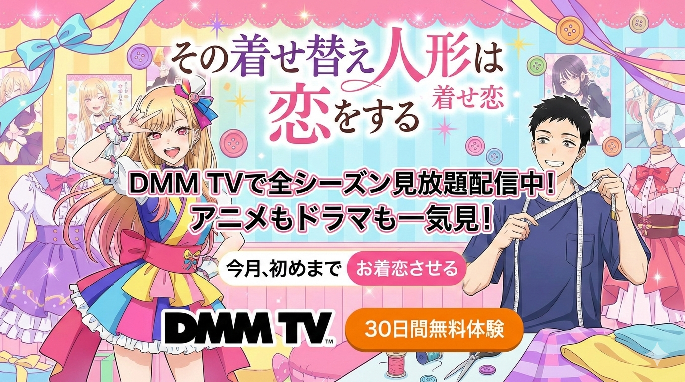 「その着せ替え人形は恋をする」(着せ恋)はDMM TVで全シーズン見放題配信中です。アニメSeason 1(全12話)とSeason 2(全12話)の全24話に加え、実写ドラマ版も月額550円(税込)で視聴でき、初回14日間の無料体験を利用すれば0円で一気見も可能です。