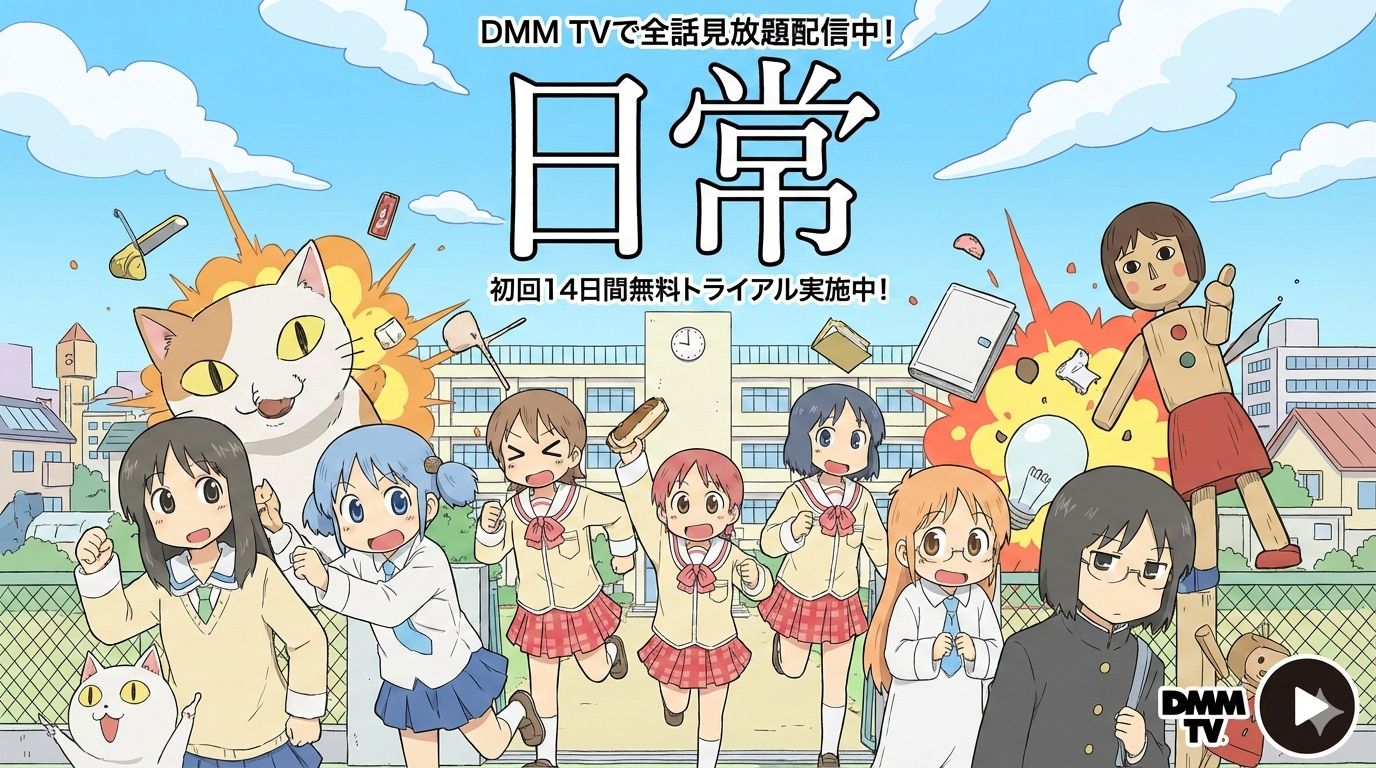 アニメ「日常」は、DMM TVで全26話が見放題配信中です。初回14日間の無料トライアルを利用すれば、月額料金を支払うことなく全話イッキ見も可能。本記事では配信情報に加え、作品のあらすじや見どころ、実際の口コミ・評判、よくある質問までまとめてお届けします。